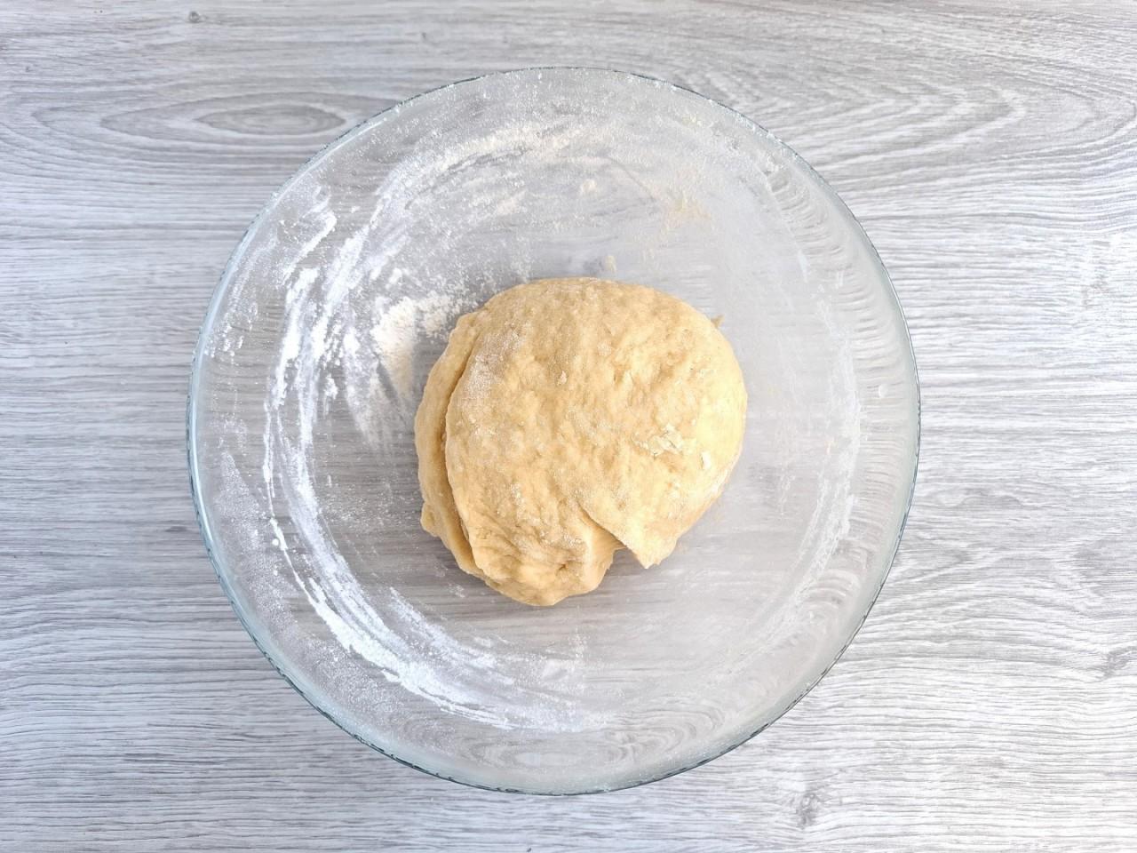 Начинайте замешивать тесто в миске вилкой или венчиком, а когда масса загустеет, выложите тесто на подпыленный мукой стол и продолжайте замес руками. Готовое тесто получается мягким, упругим и не липнет к рукам. Если муки недостаточно, нужно добавить еще немного.