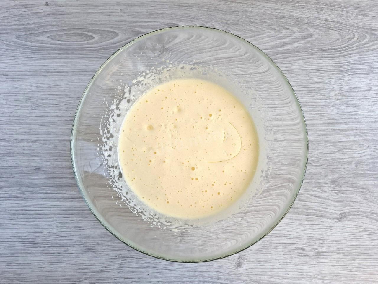 В отдельной миске взбейте яйцо с сахаром до пышного, однородного состояния без крупинок сахара, при этом масса посветлеет и увеличится в объеме в 2,5-3 раза. Добавьте в смесь растительное масло и еще раз хорошо взбейте.