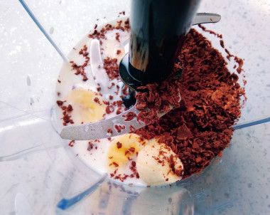 В чашу блендера выложите банан, тертый шоколад, мед и корицу.