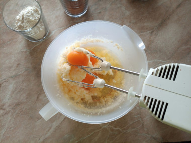 Не прекращая взбивать, введите по одному яйца, перемешивая массу после каждого яйца.