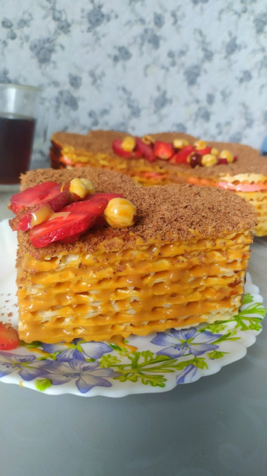 Очень вкусное и сытное лакомство с удивительным сочетанием текстур и вкусов. Вафельные коржи придают торту хрустящую и легкую структуру, а вареная сгущенка, с ее густой, кремовой текстурой и сладким, карамельным вкусом, прекрасно смягчает этот хруст. При каждом укусе чувствуешь, как хруст вафель и сладость сгущенки плавно переплетаются, создавая ощущение насыщенности и уюта. Этот торт обладает ярким карамельным привкусом благодаря вареной сгущенке, а вафли не перегружают вкус, а наоборот, идеально дополняют его. С каждым слоем торта сладость сгущенки становится более выраженной, но не слишком приторной — всё в меру.