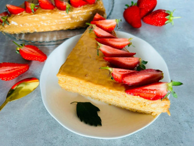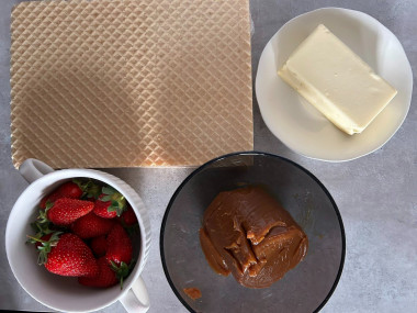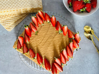 Захотелось приготовить торт из вафельных коржей с вареной сгущенкой, так как это торт из моего детства. Да и готовится он очень просто. Смешала вареную сгущенку с мягким сливочным маслом 82,5 % жирности и промазала вафельные коржи этим кремом. Поставила в холодильник на ночь, чтобы пропитался. Утром украсила клубникой. Благодарю автора за рецепт.