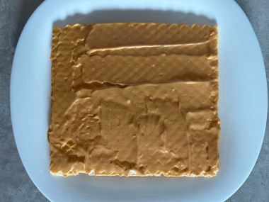 На плоское блюдо положите немного приготовленного крема, выложите сверху первый корж. Наличие крема между коржом и блюдом сделает процесс прослаивания более простым. Коржи не будут скользить по посуде. Наносите крем равномерным слоем, чтобы он заполнил все углубления в вафельных коржах. Это очень удобно делать при помощи силиконовой лопатки.