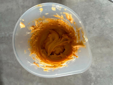 Вареную сгущенку из банок переложите в глубокую миску и добавьте сливочное масло. Масло предварительно достаньте из холодильника и дайте ему возможность размягчиться. Мне больше нравится сразу соединить сгущенку и масло в миске и размешивать столовой ложкой, разламывая масло на более мелкие кусочки. Так масло размягчается быстрее и меньше масляной посуды в итоге. Перемешивайте вареную сгущенку и сливочное масло до получения максимально однородной массы
