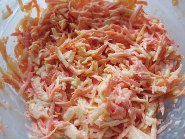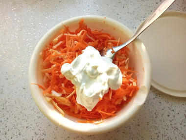 Для своего салата я взяла сладкую морковку, кисло-сладкое яблоко и сыр Маасдам. Все это натерла на крупной тёрке, получилась очень даже гармоничная смесь). Заправлять решила густой сметаной. Добавила свежий, ароматный чеснок и перемешала.