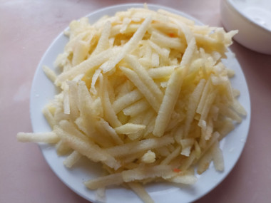 Яблоки для такого салата подойдут кисло-сладких сортов, твердые. Яблоки тщательно вымойте, снимите кожицу, если она жесткая, вырежете сердцевину с семенами. Мякоть натрите на терке или нарежьте тонкими брусочками. По желанию натертое яблоко можно сразу сбрызнуть соком лимона, чтобы оно не потемнело. Но если салат будет сразу подаваться к столу, то это делать необязательно.