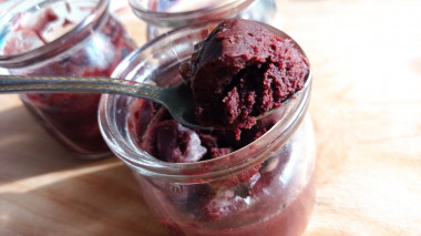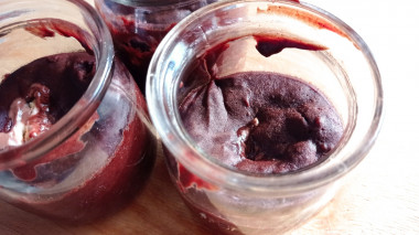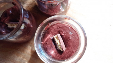 Приготовление трёх порций брауни заняло у меня 10 минут (вместе с отмыванием посуды). Запекала пирожные в баночках от йогуртницы. В качестве "сюрприза" положила в каждую баночку по квадратику молочной шоколадки с печеньем.