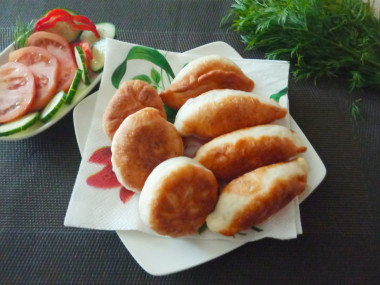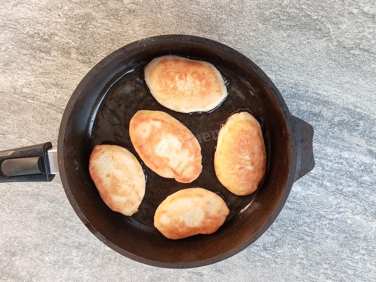 Разогрейте в сковороде растительное масло. Мне понадобилось 150 мл. Опустите в сковороду пирожки так, чтобы между ними было небольшое расстояние, так как в процессе жарки они будут увеличиваться в размере. Жарьте пирожки на среднем огне с двух сторон до золотистого цвета. С выбором сковороды и масла для жарки помогут статьи по ссылкам в конце рецепта.