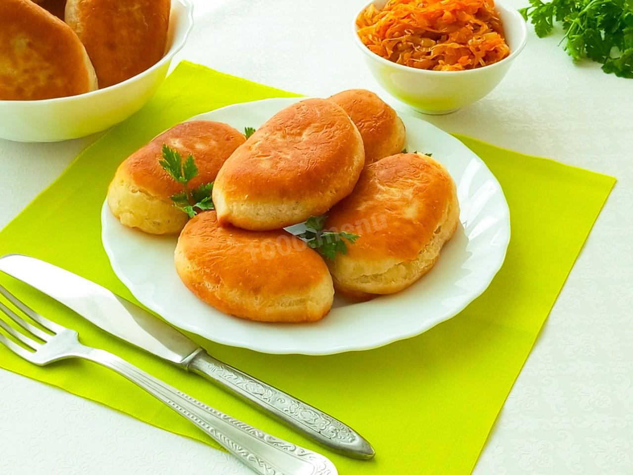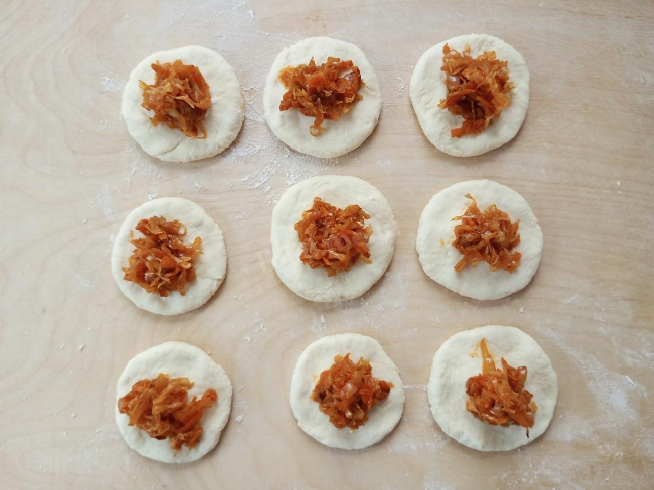 В середину каждой заготовки выложите начинку, защипните края и сформируйте пирожки. В качестве начинки я использовала тушеную капусту, можно взять мясной фарш, разнообразив его вкус вареным рисом, рубленым яйцом или луком. При желании можно расширить ассортимент начинками из отварного картофеля, повидла, творога или различных фруктов.