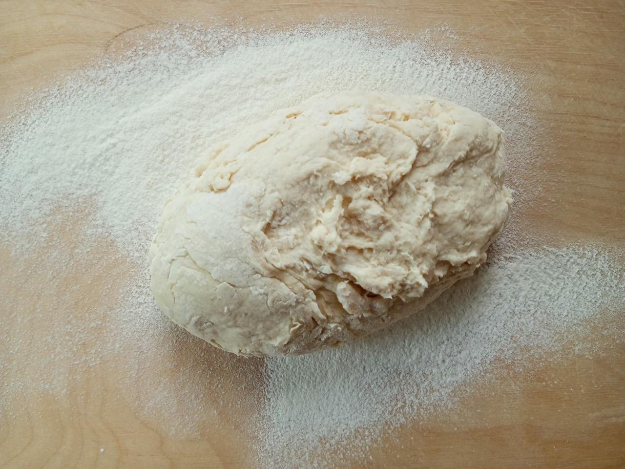 Разделочную доску присыпьте мукой и переложите на нее тесто. Аккуратно вымесите его. При необходимости добавляйте по чуть-чуть муки, но не переусердствуйте, чтобы тесто не получилось слишком плотным.