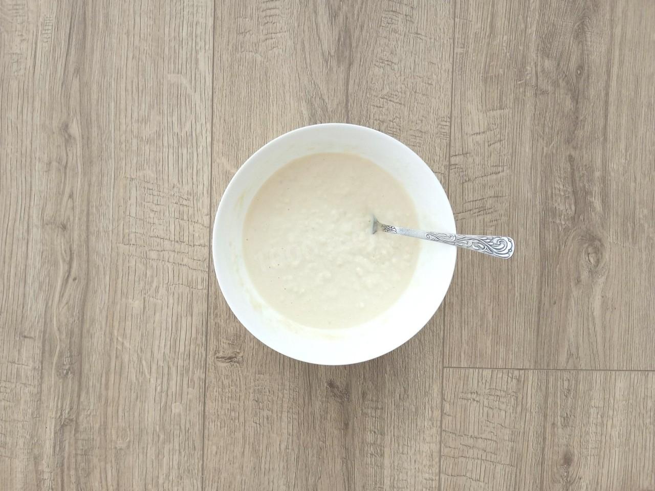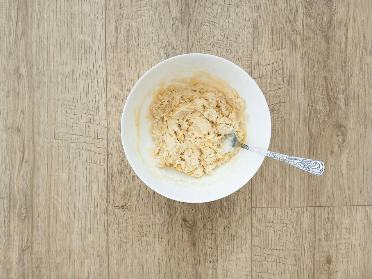 Закипятите воду и влейте в миску крутой кипяток тонкой струйкой, одновременно перемешивая всё ложкой. Тщательно перемешайте тесто. Оно получится слегка липнущим.