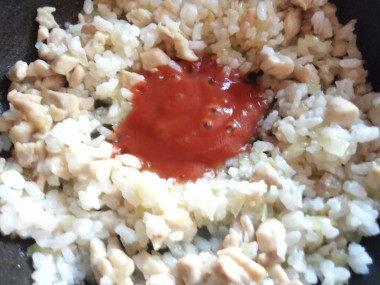 На сковороде перемещаем рис с курицей и луком к краям, а внутрь вливаем кетчуп. Постоянно перемешивая лопаткой, жарим его на сильном огне до карамелизации (30 секунд). Смешиваем кетчуп с рисом, прожариваем пару минут, и всыпаем замороженный зеленый горошек. Всю массу еще раз хорошо перемешиваем, даем горошку время разморозиться и приготовиться. Всего процесс занимает 5-7 минут.