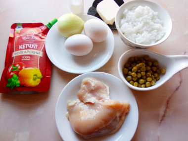 На завтрак приготовила рисовый омлет по-японски. Рис отварила накануне, чтобы утром сэкономить время. Обжарила мелко нарезанную мякоть куриного бедра, добавила к ней мелко нарезанный лук, жарила вместе до мягкости лука, затем туда же отправила отваренный рис . Кетчуп обжарила в центре сковороды. Горошек у меня был консервированный, его добавила в последнюю очередь, сразу всё перемешала и переложила полученную начинку в чашку. Взбитые с солью яйца обжаривала на сковороде в виде тонких блинчиков до тех пор, пока верхняя часть блинчиков "схватится", на нее выкладывала начинку и сразу сворачивала конвертиком, чтобы начинка не высыпалась. Омлет получился очень вкусный, с сочной начинкой. Отличный вариант, когда нужен более сытный завтрак или ужин. Спасибо автору за рецепт!