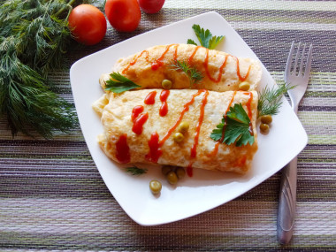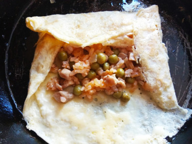 Как только верхняя часть яйца перестанет быть жидкой, выкладываем половину начинки в середину блинчика и сворачиваем его трубочкой либо конвертом. Снимаем со сковородки и повторяем процедуру со второй частью яиц и начинки.