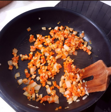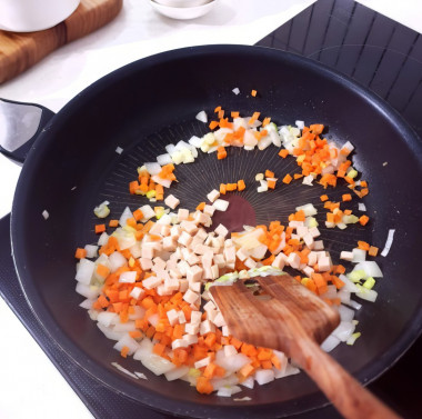У меня не было курицы, поэтому я заменила её на ветчину. Горошек тоже заменила на морковь.