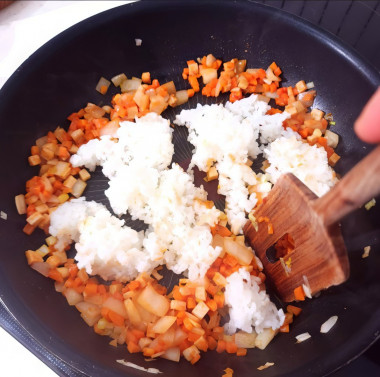 Насыпаем рис. Рис необходимо сварить заранее в большом количестве воды и промыть. Промывать рис перед варкой обязательно нужно до прозрачности в большом количестве чистой воды. Рис смешиваем с луком и мясом, прожариваем 3-4 минуты.