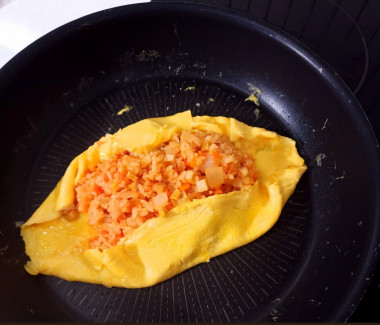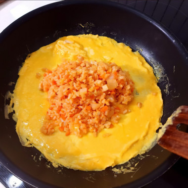 Овощи и ветчину мелко нарезала и обжарила на сковороде. Затем добавила кетчуп и перемешала. Рис заранее сварила и добавила готовый рис на сковороду. Когда начинка омлет была готова, убрала с плиты. Далее готовила яйца по рецепту. Начинку нужно выкладывать, когда яйца хорошо схватятся, будут готовы процентов на семьдесят. Омлет сворачивала лопаткой. Чтобы аккуратно выложить омлет на тарелку, нужно накрыть тарелкой омлет, и держа за дно тарелки, перевернуть сковороду. Так омлет аккуратно переворачивается и начинка не рассыпается.