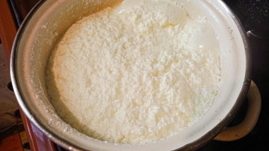 Как только начнет подниматься шапочка пены, влейте уксус и всыпьте соль. Молоко сразу начнет сворачиваться хлопьями. Мешайте молоко ложкой. Хлопья должны стать крупными, а сыворотка зеленоватого цвета. Держите молоко на огне не очень долго, хватит двух минут. Чем дольше вы будете варить, тем тверже выйдет сыр.