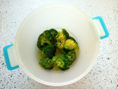По окончании времени откройте дверцу и проверьте степень готовности овощей ножом или вилкой. Если брокколи остались сырыми, верните их в печь ещё на 1-2 минуты. Мне понадобилось ещё 2 минуты. Переваривать не рекомендуется, иначе потеряете привлекательную структуру и приятный вкус продукта. Точное время приготовления будет зависеть от особенностей работы вашей микроволновки. Подробнее об этом читайте в конце рецепта.
