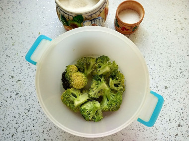 В отдельной емкости смешайте воду с сахаром и солью. На этом этапе можно добавить любимые специи по вкусу. Залейте получившейся смесью брокколи и плотно закройте крышкой. Поместите емкость в микроволновку, установите максимальную мощность и включите таймер на 2 минуты.