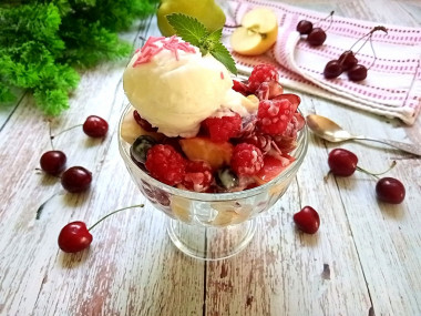 Заправила салат натуральным йогуртом без добавок и сахара. А подавала десерт в креманках с шариком домашнего ванильного мороженого.