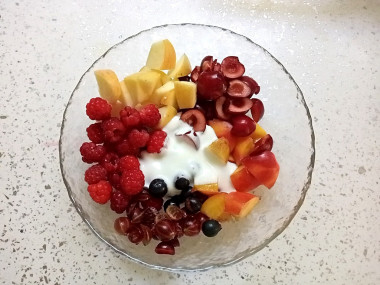 Все приготовленные фрукты кладем в глубокую миску. Заправку также можно подобрать по своему желанию: низкокалорийный натуральный йогурт без сахара, сметана или мороженое. Заправляем сметаной, йогуртом или жирными сливками.