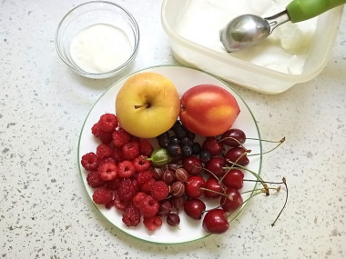 Давно хотела сделать летний десерт с мороженым и фруктами! Наконец-то, настало время сезонных фруктов и ягод, из них я и готовила свой салатик.