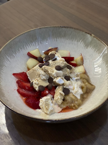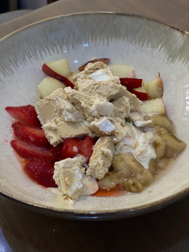 Искала что можно сделать из нектаринки ( у нас называют их лысыми персиками). Наткнулась на этот рецепт, сразу взялась за готовку. Ну очень вкусно! У меня нектарины, клубника и бананы, еще украсила шоколадом, получилась нереально вкусно! Буду гостям тоже предлагать, подходит даже для полноценного десерта!