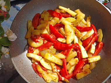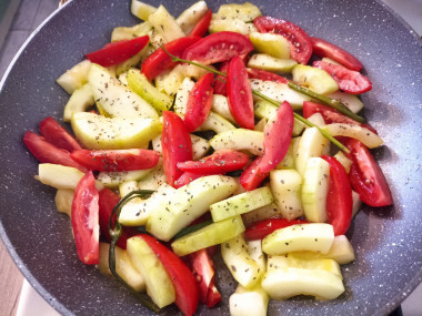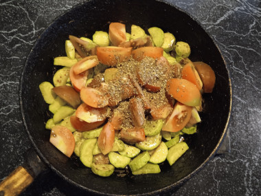 Я готовлю соте из кабачков с помидорами по похожему рецепту. Пойдет как самостоятельное блюдо или гарнир.