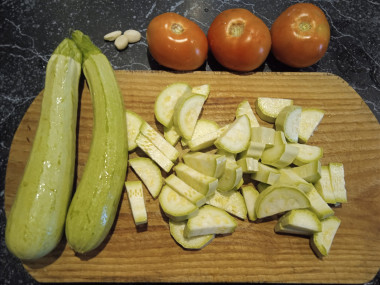 Как сделать кабачки с помидорами и чесноком на сковороде? Подготовьте ингредиенты. Кабачки можете взять любые, но предпочтительней - молодые, с нежной кожицей. Если у вас более старые кабачки, очистите их от кожуры и избавьте от твердых семян. Помидоры выбирайте мясистые, сочные. Растительное масло - любое, набор специй выбирайте под свой вкус. Овощи и зелень вымойте и обсушите.
