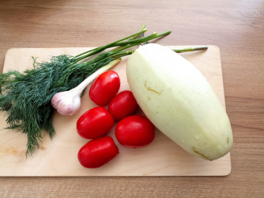 Кабачок взяла молодой, не чистила и порезала крупно, как пишет автор. Помидоры порезала дольками. Чеснок по рекомендации автора пропустила через пресс. Обжарила кабачок, добавила помидоры и специи. Налила воды немного больше, чем указано в рецепте, нам очень нравится овощная юшечка) Протушила всё вместе. Положила чеснок и укроп. Блюдо готово!
