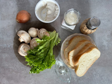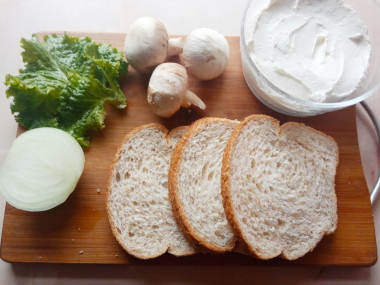 Как сделать бутерброды с шампиньонами? Подготовьте для этого необходимые ингредиенты. Для приготовления бутербродов можно использовать любой вид хлеба. Ориентируйтесь на свой вкус. Я беру несколько ломтиков белого хлеба. Творожный сыр заранее достаньте из холодильника, чтобы он немного нагрелся. Так его будет легче мазать.