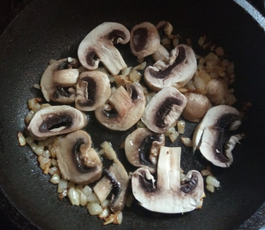 Затем выложите в сковороду нарезанные шампиньоны. Перемешайте вместе с луком жарьте все вместе под крышкой 5-7 минут. При жарке шампиньоны пустят сок. Но за время приготовления он испарится. Шампиньоны немного посыпьте солью.