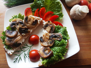 Накануне приготовила домашний творожный сыр, поэтому для завтрака выбрала рецепт бутербродов с шампиньонами. Лук мелко нарезала, обжарила на растительном масле, добавила нарезанные ломтиками шампиньоны, обжарила всё вместе до зарумянивания ( это занимает немного времени). Хлеб взяла отрубной, тостовый, его тоже слегка обжарила на сухой сковороде. Ломтики хлеба намазала творожным сыром, положила на каждый по листочку салата и шампиньоны с луком. Очень аппетитные, вкусные бутерброды! Идеальное сочетание продуктов! По желанию можно дополнить свежими овощами. Спасибо за вкуснейший рецепт, Юлия М!