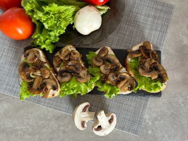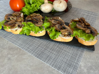 Бутерброды с шампиньонами - это самые необычные бутерброды которые я пробовала. Увидев их на картинке решила что я должна их попробовать. Готовила 4 порции (количество продуктов легко рассчитать благодаря калькулятору порций). Ломтики батона подсушила в духовке при температуре 200 градусов в течении 7-8 минут. Творожный сыр взяла тоже с грибами. Дала батону чуть-чуть остыть, намазала творожный сыр, лист салата и грибы с луком (предварительно обжарила их на растительном масле до готовности). Хрустящий батон, сливочный сыр, свежий лист салата и сочные и ароматные грибы - очень вкусные бутерброды получились. Буду готовить еще не один раз. Спасибо за рецепт.