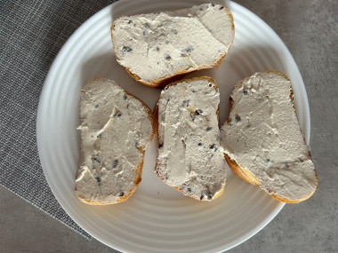 Ломтики хлеба намажьте творожным сливочным сыром. По желанию хлеб можно немного подсушить в духовке или обжарить на сковороде.