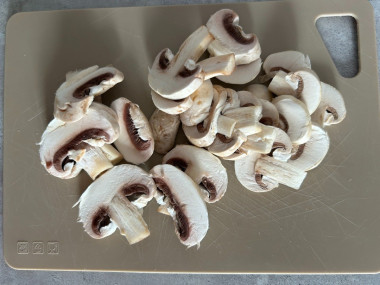 Шампиньоны хорошо промойте в проточной воде от загрязнений. Затем нарежьте шампиньоны ломтиками.