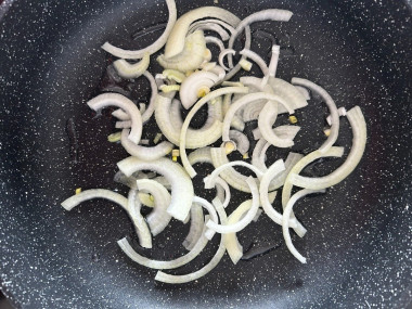 Сковороду для жарки разогрейте до горячего состояния и налейте на неё немного растительного масла. Выложите нарезанный лук и обжаривайте его в течение минуты, чтобы он стал прозрачнее. От жарки лука появится характерный аромат.