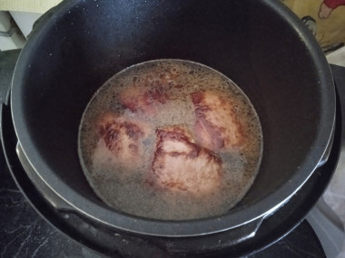 В чашу мультиварки вливаем куриный бульон, пропариваем несколько минут. Возвращаем отбивные обратно в мультиварку. Выкладываем мясо так, чтобы оно было полностью покрыто соусом, закрываем крышку мультиварки и готовим на режиме жарки в течение 20 минут.