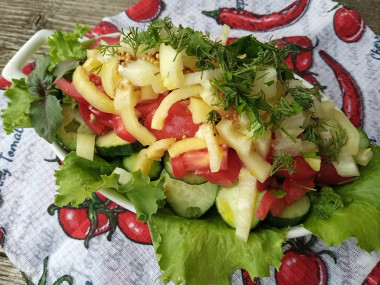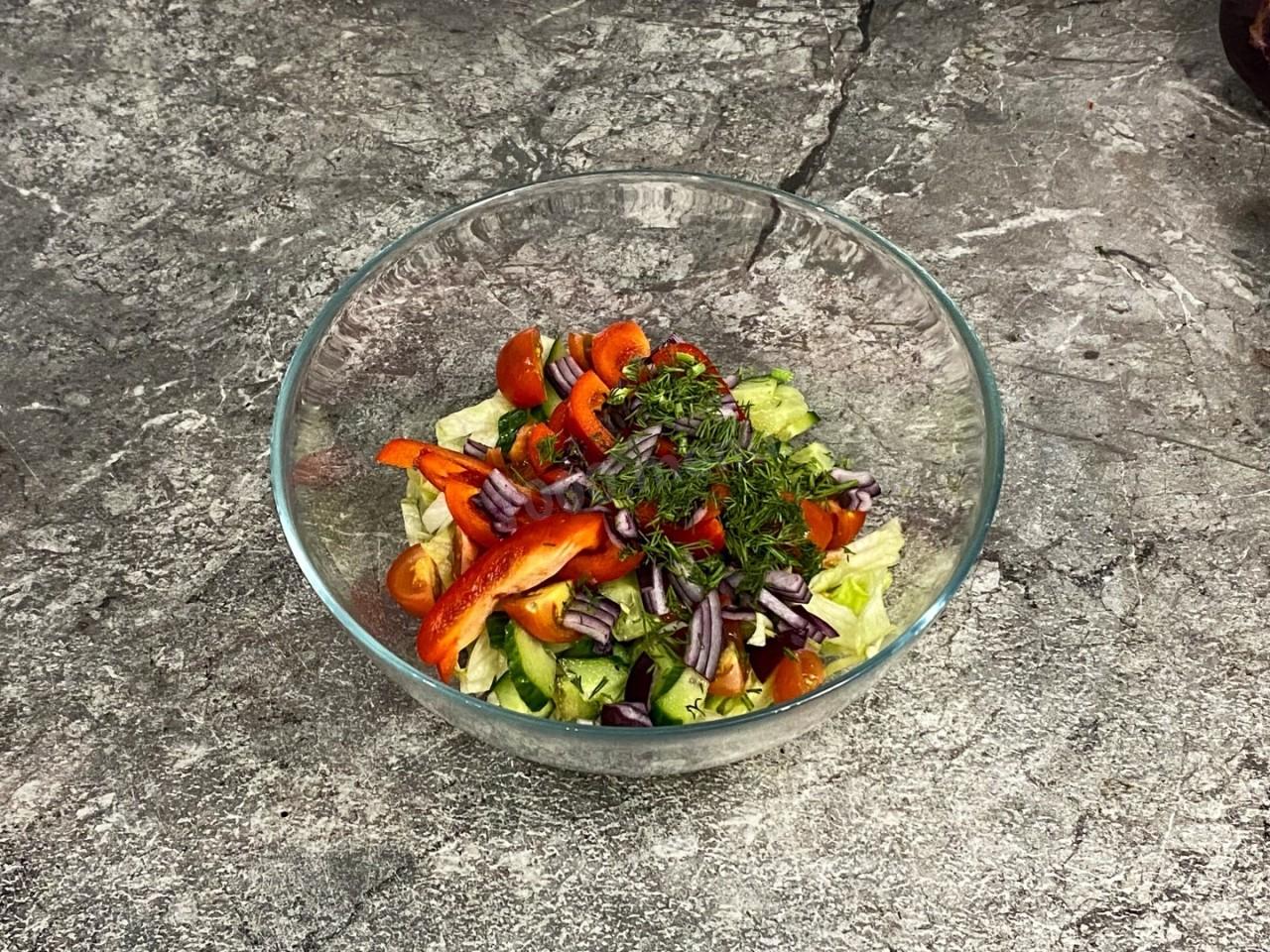 Затем посыпьте салат любимой свежей зеленью, например укропом и петрушкой, и приправьте черным молотым перцем по желанию. Перед подачей хорошенько перемешайте салат, попробуйте и при необходимости добавьте соли. Подавайте салат к столу. Очень вкусно со свежеиспеченным хлебом — аромат сока, оставшегося на дне салатницы, будет восхитительным! Приятного аппетита!