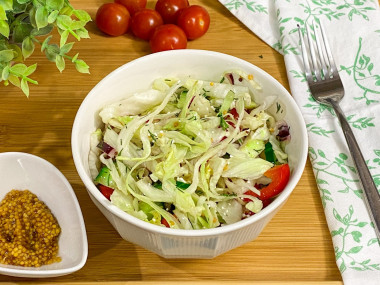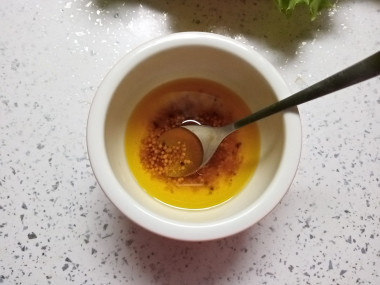 В рецепте салата с французской горчицей помидорами и огурцами используются самые популярные овощи лета. Думаю, каждая хозяюшка чуть ли не каждый день делает на ужин подобный салатик) Но в этом салате кроме вкусных сочных овощей есть очень вкусная заправка! Для неё я смешала горчичное нерафинированное масло с зернистой горчицей и лимонным соком. Аромат просто волшебный! В салат ещё добавила душистой зелени, у меня был укроп, петрушка, сельдерей. Листовой салат тоже использовала, он очень полезный. Творог не стала добавлять, т. к. салат подавала к мясу в виде гарнира. Салат просто великолепен, он заиграл новыми красками и вкусами) Заправка ароматная, имеет насыщенный вкус, а зернышки горчицы приятно похрустывают.