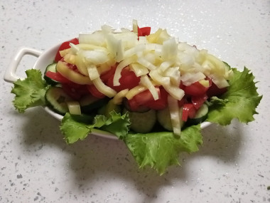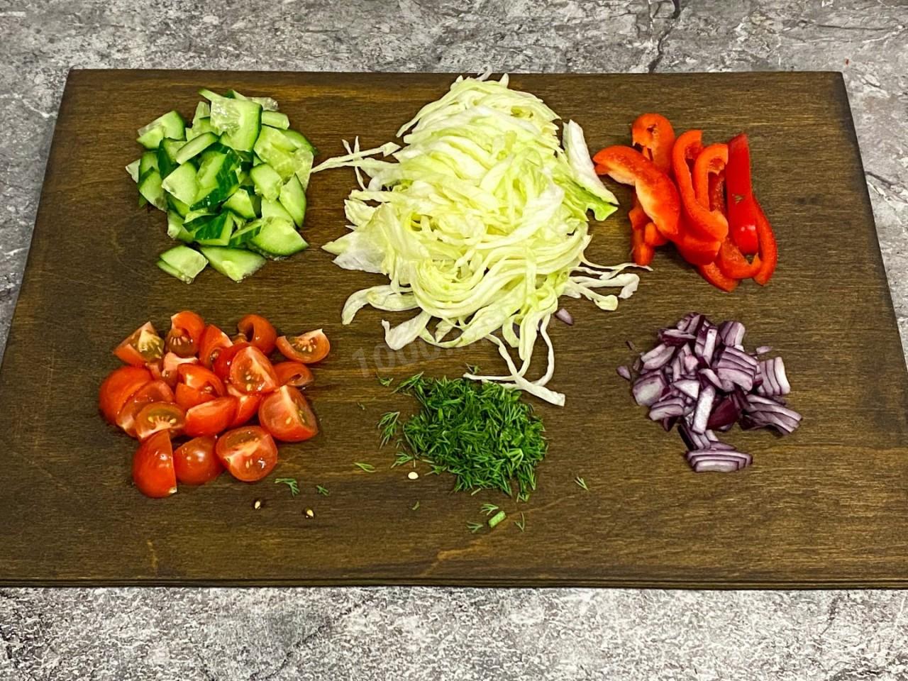 Нарежьте листья салата полосками или квадратиками. Выбирайте форму нарезки по своему вкусу. Выложите салат первым слоем в салатницу. Далее порежьте огурец и помидор дольками и добавьте их поверх листьев. Следующий слой сделайте из сладкого болгарского перца, нарезанного полукольцами или кольцами. Поверх положите лук, нарезанный перьями. Лучше возьмите красный, белый или шалот — такие сорта мягче на вкус и отлично подойдут для салата.