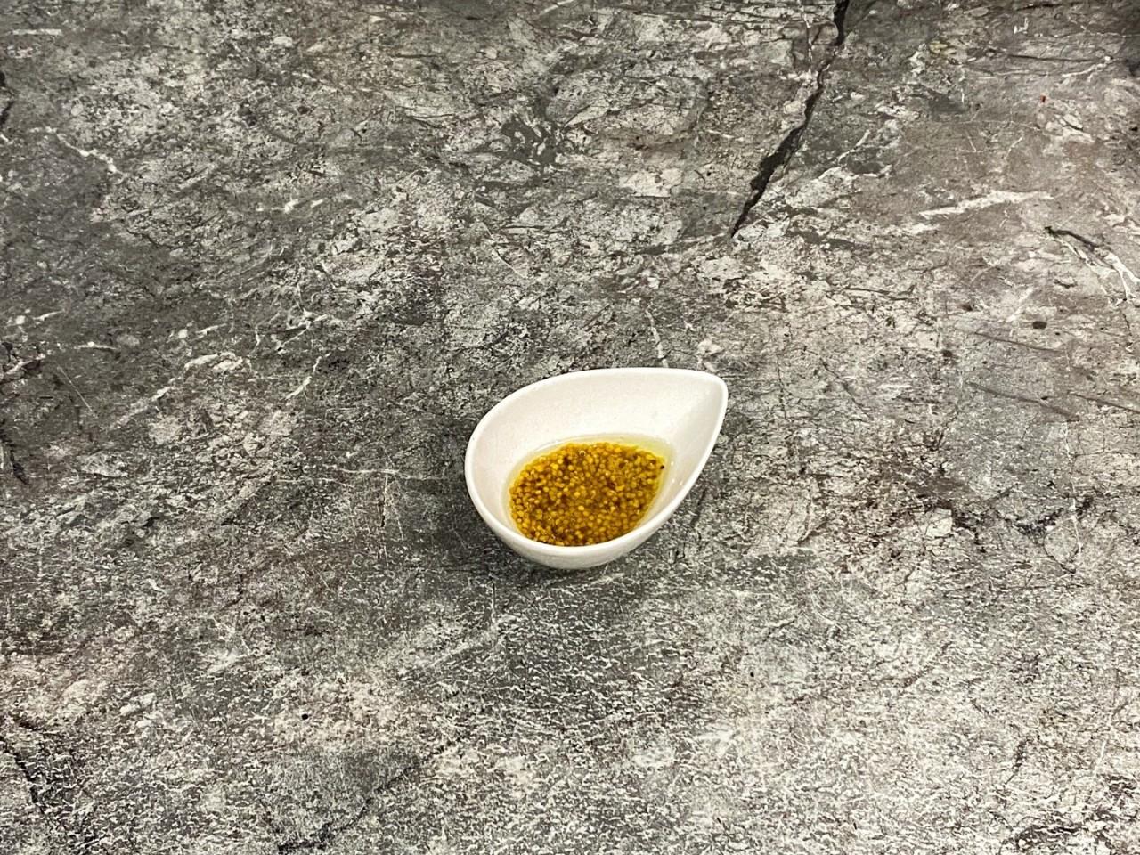 Теперь приготовьте заправку: смешайте отдельно французскую горчицу, растительное масло и свежий лимонный или лаймовый сок. Тщательно перемешайте смесь. На верхний слой аккуратно уложите крупнозернистый творог, слегка присолите его и полейте заправкой из горчицы равномерным слоем. Творог выбирайте качественный, без заменителей молочного жира. С выбором поможет статья по ссылке в конце рецепта.