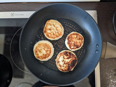 Жарила сырники на сковороде с растительным маслом. По 3 мин с каждой стороны, накрывала крышкой, чтобы пропеклись внутри.