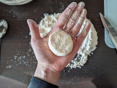 Сырники, обвалянные в муке, лучше сразу отправлять на сковородку, чтобы они не прилипали к рабочей поверхности, пока ждут обжарки.