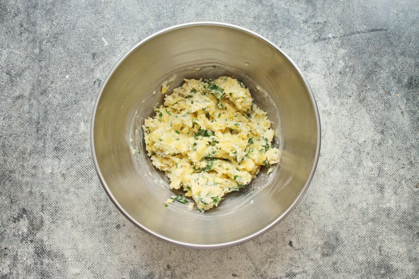Подготовьте все необходимые ингредиенты. Зелень вымойте и обсушите. Картофель лучше отварить с вечера, так он будет легче тереться и не превратится в пюре. Какой сорт картофеля выбрать для приготовления можно прочитать в статье под рецептом.