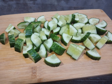 Огурцы вымойте, обсушите и нарежьте небольшими кусочками. Если кожица у огурцов грубая, то при желании её можно срезать.