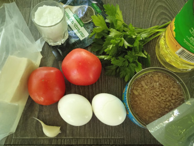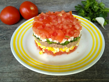 Это и красиво, и аппетитно, и оригинально, и очень вкусно! Консервированный тунец выбрала измельчённый, вместо базилика взяла петрушку, а моцареллу заменила на сыр тофу. Удалила мякоть из помидоров по описанию в рецепте. Порезала всё кубиками и сделала заправку. Не имея кулинарного кольца, использовала обрезанную пластиковую бутылку. Собрала салат слоями. От себя ещё добавила слой варёного яйца для сытности. Очень простое и достаточно быстрое приготовление салата. Изумительный вид привёл всех в восторг. Вкус салата невероятный, идеальное сочетание всех ингредиентов. Чеснок придаёт особого вкуса. Безумно вкусно! Замечательный рецепт! Благодарю автора!