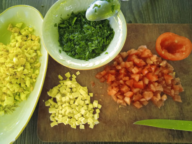 Подготовленные помидоры без мякоти нарежьте небольшими кубиками.