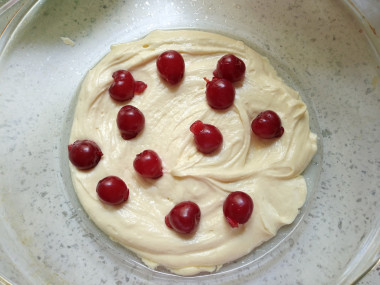 Форму для выпечки смажьте маслом и присыпьте мукой. На дно выложите немного теста. Сверху распределите часть ягод. Накройте еще слоем теста, сверху разложите еще немного ягод. Повторите слои. Последним слоем должно быть тесто.